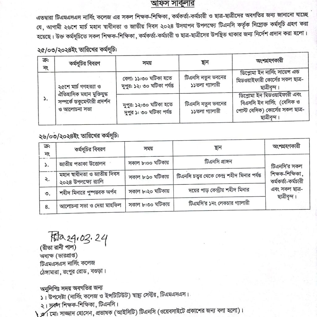 ২৬ শে মার্চ মহান স্বাধীনতা দিবস-২০২৪ উদযাপন উপলক্ষে টিএমএসএস নার্সিং কলেজ কর্তৃক গ্রহনকৃত কর্মসূচিPost author:TNCictPost published:March 24, 2024Post category:UncategorizedPost comments:0 Comments You Might Also Like টিএমএসএস নার্সিং কলেজ এর প্রাক্তন শিক্ষার্থীদের এলামনাই এসোসিয়েশন কমিটি গঠন ও পুনর্মিলনী আয়োজন উপলখ্যে জরুরী নোটিশJanuary 21, 2025 “বুদ্ধ পূর্ণিমা”(বৈশাখী পূর্ণিমা) উপলক্ষ্যে কলেজ এর সকল কার্যক্রম বন্ধ থাকবেMay 21, 2024 পবিত্র “আশুরা” উপলক্ষ্যে প্রতিষ্ঠানের সকল কার্যক্রম বন্ধ থাকবেJuly 16, 2024Leave a Reply Cancel replyCommentEnter your name or username to commentEnter your email address to commentEnter your website URL (optional) Save my name, email, and website in this browser for the next time I comment.