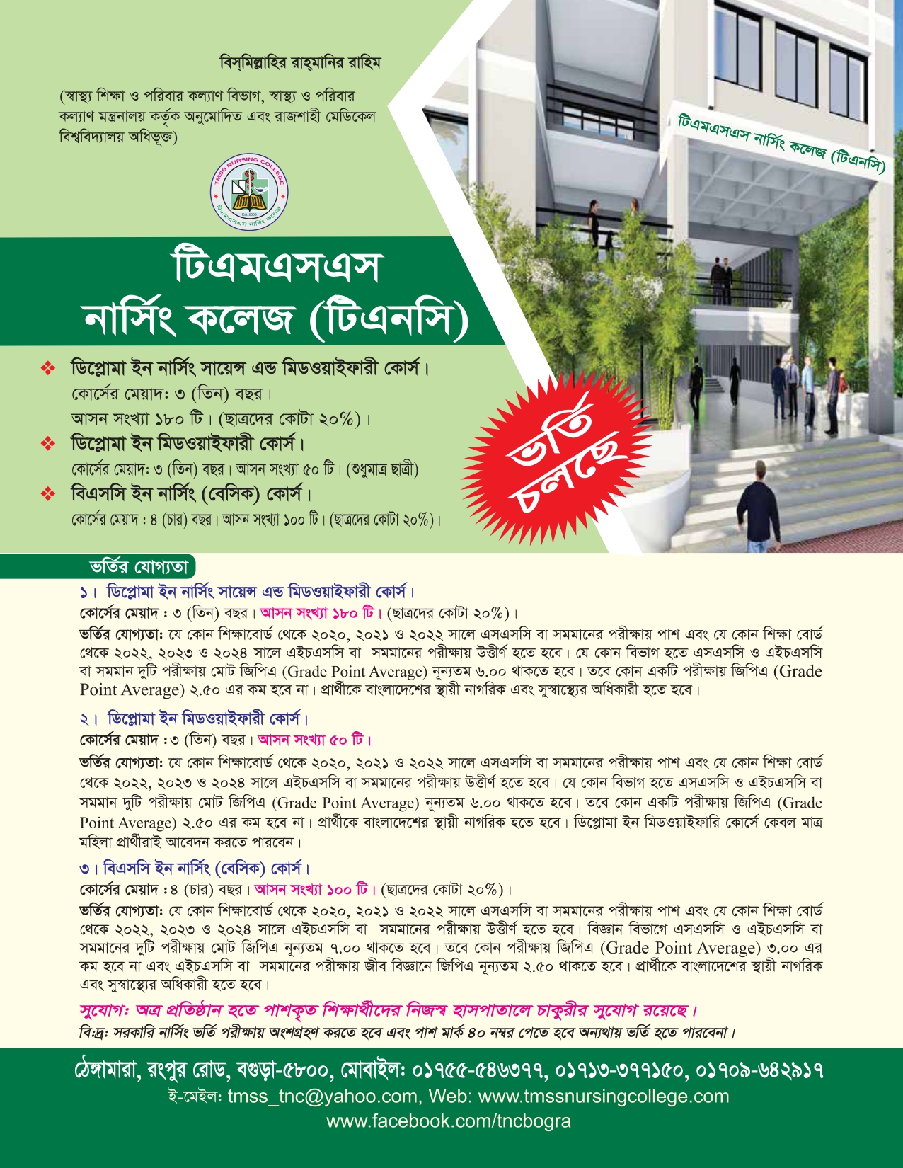 Location: TMSS Nursing College is situated in a tranquil place of natural beauty named Thengamara 6km north to Bogura town beside Bogura-Rangpur highway attached to 18 storied 1000 bedded TMSS Medical College and Rafatullah Community Hospital.